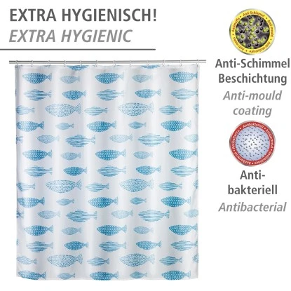 Mit dem Wenko Anti-Schimmel Duschvorhang in Aquamarin sind die Zeiten von angeschimmelten Duschvorhängen vorbei. Zusätzlich ist der schöne und effektive Helfer auch anti-bakteriell beschichtet. Wenko bringt mit diesem Novum Hygiene und Design ins Badezimmer. Natürlich ist dieser Duschvorhang EU-patentiert. Auch in Sachen Optik muss sich der attraktive Vorhang nicht verstecken. Das ausgefallene Fisch-Design in wunderschönem Aquamarin auf weißem Hintergrund verleiht Ihrem Bad eine entspannte Atmosphäre. Mit einer Breite von 180 cm eignet sich der ausgefallene Duschvorhang sowohl für Dusche als auch Badewanne. Der hochwertig verarbeitete Duschvorhang ist aus besonders haltbarem Polyester hergestellt. Durch die Oberflächen-Veredelung ist das Material wasserabweisend. Er ist pflegeleicht und bei 30 °C waschbar. Der obere Saum ist mit einer verstärkten Lochleiste und rostfreien Metallösen versehen. Am unteren Ende ist ein umweltfreundliches Gewichtsband aus Gummi (statt Bleikette) formgebend. Im Lieferumfang sind 12 weiße Duschvorhangringe aus Kunststoff enthalten. Im Design des Duschvorhangs hat Wenko auch die korrespondierenden Accessoires! Der passende Zahnputzbecher & Seifenspender sowie die Seifenablage und WC-Garnitur Aquamarin bereichern das Flair zusätzlich.