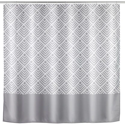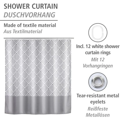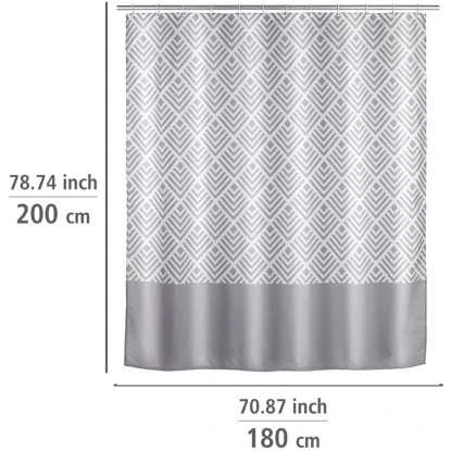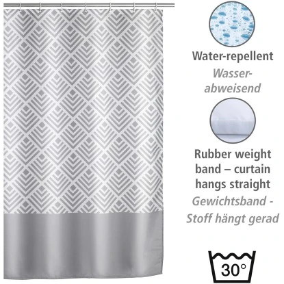Mit dem Wenko Anti-Schimmel Duschvorhang Echo sind die Zeiten von angeschimmelten Duschvorhängen vorbei. Zusätzlich ist der schöne und effektive Helfer auch anti-bakteriell beschichtet. Wenko bringt mit diesem Novum Hygiene und Design ins Badezimmer. Natürlich ist dieser Duschvorhang EU-patentiert. Auch in Sachen Optik muss sich der attraktive Vorhang Echo nicht verstecken. Das grau-weiße Muster versprüht stilvolle Eleganz im Badezimmer. Mit einer Breite von 180 cm eignet sich der ausgefallene Duschvorhang sowohl für Dusche als auch Badewanne. Der hochwertig verarbeitete Duschvorhang ist aus besonders haltbarem Polyester hergestellt. Durch die Oberflächen-Veredelung erhält das Material einen wasserabweisenden Effekt, der zusätzlich für ein einfaches Abperlen von Feuchtigkeit und Wasserspritzer sorgt. Die Feuchtigkeit sammelt sich nicht mehr in den Vorhangfalten. Die Duschvorhänge sind deswegen besonders lange haltbar und trocknen nachweislich schneller. Er ist pflegeleicht und bei 30 °C waschbar. Der obere Saum ist mit einer verstärkten Lochleiste und rostfreien Metallösen versehen. Am unteren Ende ist ein umweltfreundliches Gewichtsband aus Gummi (statt Bleikette) formgebend. Im Lieferumfang sind 12 weiße Duschvorhangringe aus Kunststoff enthalten.