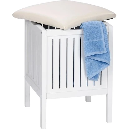 Viel Stauraum für Wäsche bietet der gemütliche Badhocker unter der gepolsterten Sitzfläche aus der Badserie Oslo. Das großzügige, bequeme Kissen lädt jederzeit zum Sitzen ein. Ebenso ist der Hocker auch als Ablagefläche geeignet.