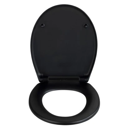 Der Premium WC-Sitz Ikaria im matten Schwarz überzeugt durch elegante Optik und bringt Design in jedes Bad und Gäste-WC. Der Soft-Touch-Effekt sorgt für eine matte und weiche Oberfläche, die besonders beständig gegen Fingerabdrücke ist. Neben dem angenehmen Sitzkomfort ist der Toilettensitz auch mit praktischen Zusatzfunktionen ausgestattet. Die integrierte Easy-Close-Absenkautomatik sorgt für sanftes und leises Schließen des Toilettendeckels. Durch das langsame Absenken wird auch ein Einklemmen von Fingern und Kleidung verhindert. Seine 1-Knopf Fix-Clip Hygienebefestigung aus rostfreiem Edelstahl ermöglicht eine schnelle Montage und Reinigung, da der komplette Sitz einfach wieder abnehm- und aufclipsbar ist. Seine Befestigung ist flexibel einstellbar passend für handelsübliche WCs. Ein praktischer Wandpuffer ist im Lieferumfang enthalten. Ein zusätzlicher Gummieinsatz, der mit der Fix-Clip Befestigung auf der WC-Schüssel angebracht wird, verhindert das Verrutschen des WC-Sitzes.Der WC-Sitz Ikaria ist aus antibakteriellem Duroplast hergestellt. Duroplast WC-Sitze werden in einem aufwendigen thermomechanischen Verfahren hergestellt und vereinen hochwertige Qualität und Funktionalität. Daher eignet er sich auch sehr gut zum Einsatz auf Toiletten mit erhöhtem Publikumsverkehr, wie z.B. in Geschäften, Praxen oder Büros, da er sehr kratzfest, bruchsicher und strapazierfähig ist. Das antibakterielle Duroplast sorgt für mehr Hygiene im Bad.