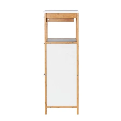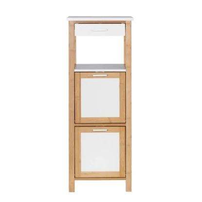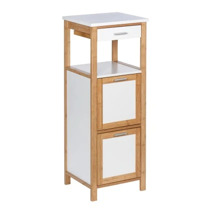 Die charmante Wohn-Serie Finja im trendigen Scandi-Style bringt die nordische Wohnkultur mit schlichter Formalität, Minimalismus und Funktionalität in jeden Haushalt. Wenko hat sehr viel Wert auf eine hohe Qualität gelegt – genau deswegen ist die Finja Möbel-Serie auch besonders haltbar und robust aber zeitgleich mit den typischen simplen, aber harmonischen Formen gestaltet. Alle Einrichtungsgegenstände sind aus hochwertigem Bambus gefertigt, welcher hart und widerstandsfähig ist. Auch unter ökologischen Aspekten bieten alle Möbelstücke der Finja-Serie klare Vorteile: Bambus ist ein schnell nachwachsender Rohstoff und liegt absolut im Trend. Die MDF-Ablagen sind im schlichten Weiß gehalten. Das moderne Standregal Finja bietet mit seinen zwei Ablagen, zwei Staufächern und einer Schublade viel Platz für Handtücher, Bücher, Küchenutensilien, Kosmetik, Accessoires und Dekoration. Egal, wo Sie das charmante Haushalts- und Badregal platzieren, ob im Bad, Schlafzimmer, Flur, in der Küche oder im Wohnzimmer – das charmante Regal macht immer eine gute Figur und ist vielseitig einsetzbar.