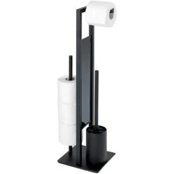 Die Wenko Stand WC-Garnitur Rivalta in Schwarz ist die praktische 3-in-1 Kombination aus offenem WC-Bürstenhalter, einem offenen Toilettenpapierrollenhalter und einem Ersatzrollenhalter für bis zu drei weitere Rollen.
