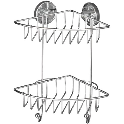 Das Vacuum-Loc Eckregal Bari bietet starken Halt und überzeugende Qualität auf zwei Etagen. Verteilt auf zwei Körbe, können Pflege-Artikel und Bad-Accessoires platzsparend untergebracht werden. Die beiden Haken sorgen für zusätzliche Aufhängemöglichkeiten. Waschlappen und Handtücher werden so stets dekorativ und übersichtlich griffbereit gehalten.