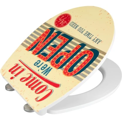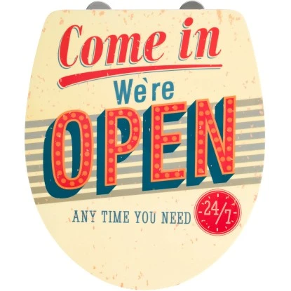 Als ein echtes Deko-Highlight präsentiert sich der nostalgisch im Retrolook gestaltete WC-Sitz Vintage Open. Mit seinem Schriftzug bietet er den perfekten Look für jedes Badezimmer und Gäste-WC. Seine ausgefallene Hochglanz-Oberfläche setzt das Retro-Motiv perfekt in Szene.