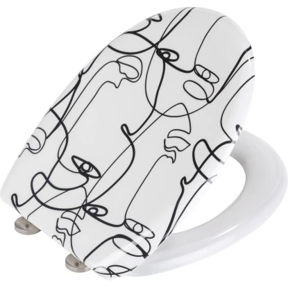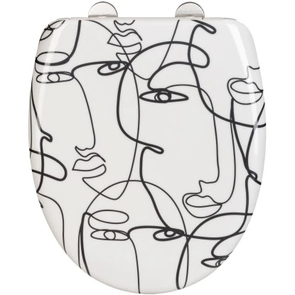 Der Wenko Duroplast Design WC-Sitz Faces ziert filigrane schwarze Linien, die mal feiner und mal kräftiger mehrere Gesichter auf den weißen Toilettendeckel zaubern. Der Black & White Einrichtungsstil liegt weiterhin absolut im Trend. Das moderne Design fügt sich harmonisch in das bestehende Badezimmer-Interieur ein, ohne dabei aufdringlich zu wirken.